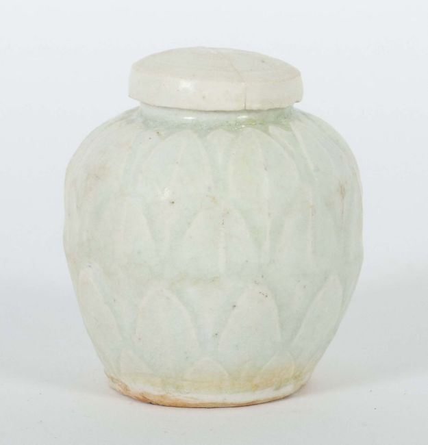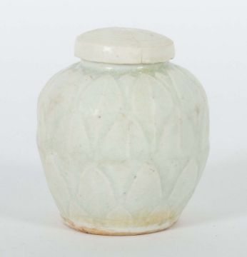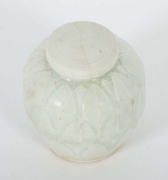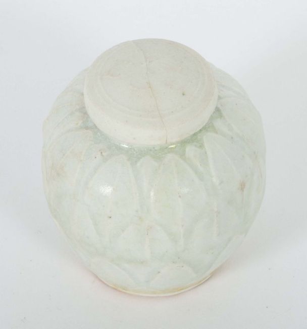 China, Song-Dynastie, 960 - 1279, Qingbei-Keramik, weißer Scherben, feine Craqueléeglasur, Reliefdekor mit Lotusblättern, Deckel mit leicht reliefierter Blüte, H: ca. 8 cm. Deckel geklebt und best., Standkante rest. Provenienz: Bayerische Privatsammlung.