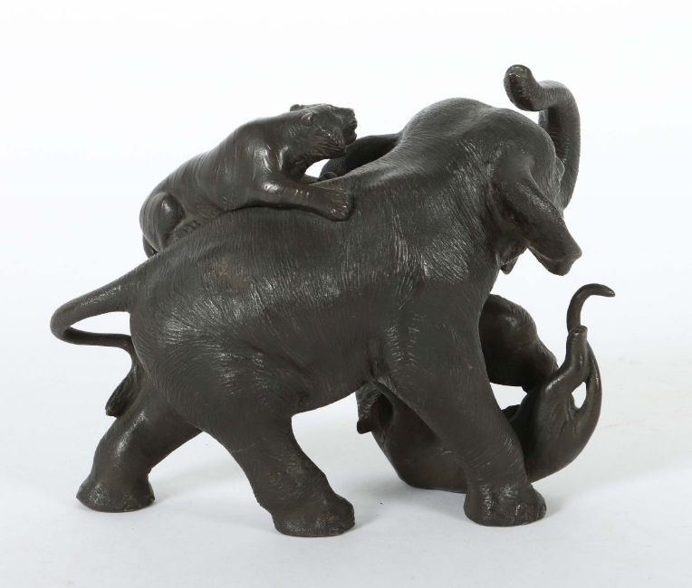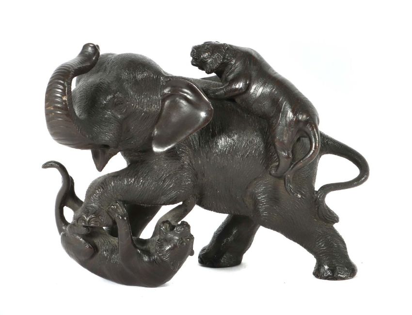 Japan, 19./20. Jh., Bronze, patiniert, vollplastische Ausführung, am Bauch eine 3 Zeichenmarke, HxL: ca. 14/18 cm. Stoßzähne fehlen.