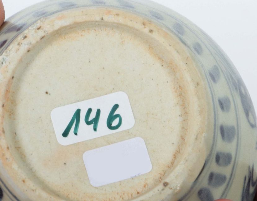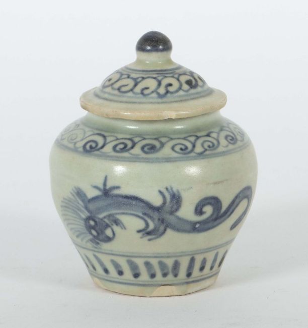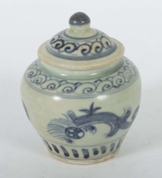 China, Ming-Dynastie, 1368 - 1644, Steingut, glasiert, blaue Unterglasurbemalung, dekoriert mit Wellenband auf Deckel und Gefäß, darunter zwei Tierdarstellungen (Grottenolm ?), Boden mit kurzer Standkante, H: ca. 11,2 cm. Deckel mit kl. Chip. Provenienz: Bayerische Privatsammlung.