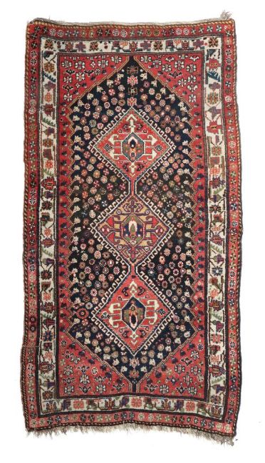 Persien, wohl um 1930, Wolle auf Wolle, 3 miteinander verbundene Qashqai-Medaillons auf blütengemustertem, schwarzgrundigem Fond eingerahmt von einem rotgrundigen Doppelnischenfeld, wollweiße Hauptbordüre mit geometrisierter Palmettenranke, LxB: 238/128 cm. Tretfalten, unteres Ende ausfransend, oberes Ende mit orig., abgeflochtenem Abschluss (eine Ecke ausfransend).
