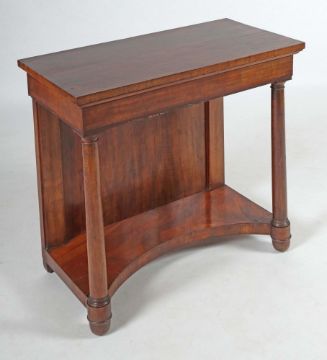 19. Jh., Nussbaum furniert, frontseitig konkav ausgesägte Bodenplatte, zwei Frontsäulen, die Rückwand in gefüllter Rahmenbauweise, Konsolentischplatte auf hoher Zarge, HxBxT: 91/86/43 cm. Trockenrisse, Flecken, Bestoßungen.