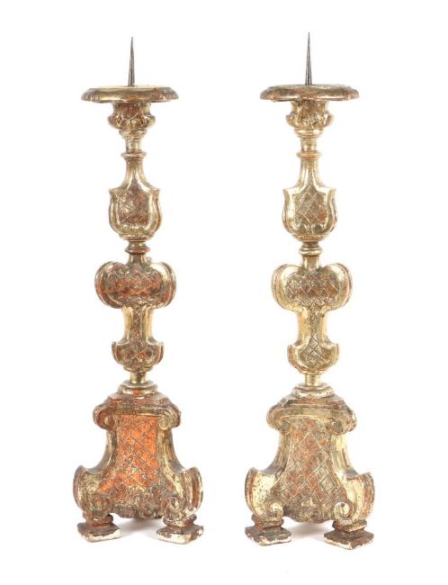 18./19. Jh., Holz geschnitzt, silberfarben gefasst, dreiseitiges Postament mit dreiseitigem Säulenschaft in Form von rautengemusterten Kartuschen, H: 73 cm + Eisendorn. Stark berieben, Abplatzer.