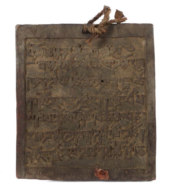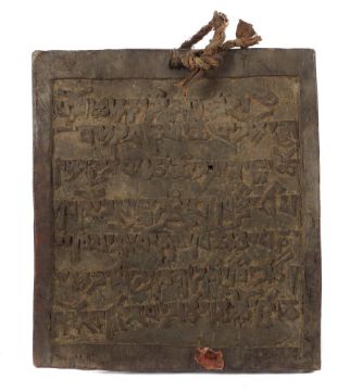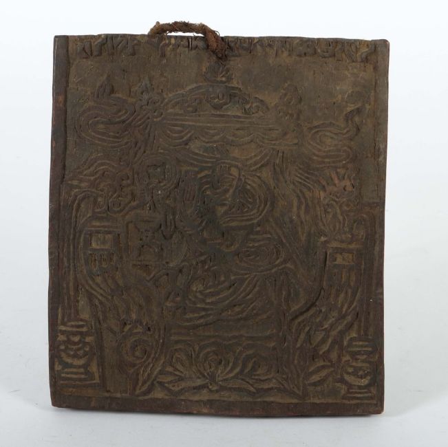 Tibet, 17./18. Jh., Hartholztafel, beidseitig beschnitzt, auf der Schauseite ein Geistlicher in einer Pagode, darüber beschriftet, die Gegenseite mit Schriftbild, Reste eines Lacksiegels, HxBxD: ca. 20,5/18,5/1,8 cm. Provenienz: Privatsammlung Baden-Württemberg, vor 1977 erworben.