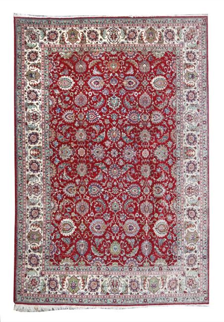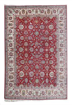 Persien, um 1950, Wolle auf Baumwolle, sign. im inneren Begleitstreifen, das rote Innenfeld durchgemustert mit Spiralranken und großen Palmetten mit Wolkenbändern, wollweiße Herati-Bordüre, LxB: 398/297 cm. Flecken, stellenweise dünn, neu gesichert, unten ausfransend.