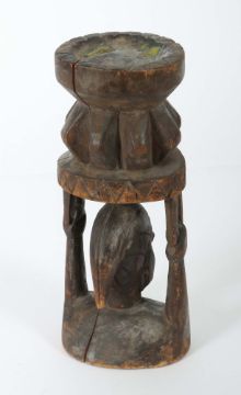 Nigeria, Holz, geschnitzt als Karyatidenbüste, die mit erhobenen Armen eine Fußschale mit gerippter Wandung über dem bemützten Kopf trägt, gebohrte Pupillen, H: 32,5 cm. Trockenrisse.