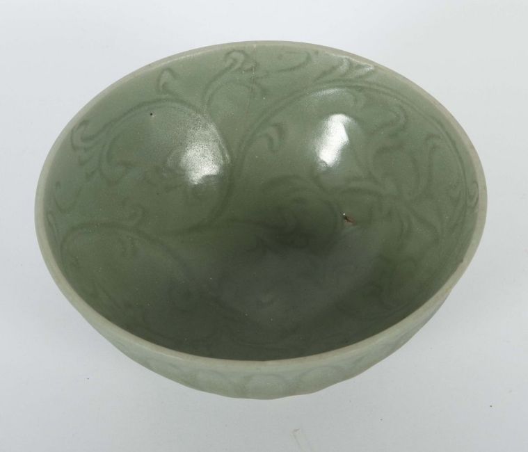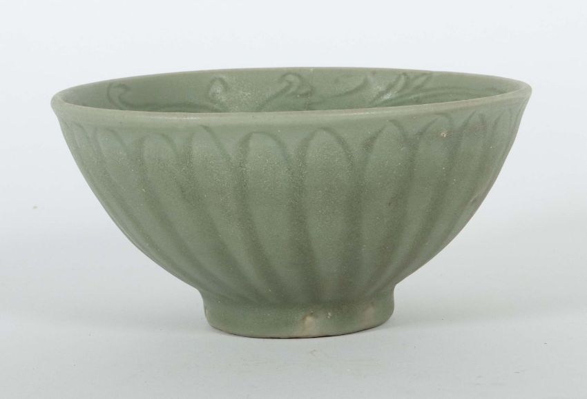 China, Yuan-Dynastie, 1279 - 1368, Keramik, roter Scherben, seladonfarben glasiert, die Außenwandung mit leicht relieferten Blütenblättern der Lotusblume, die Innenwandung mit Unterglasurbemalung, Dekor mit Blattranken, Gefäß auf kurzem Standring, HxD: ca. 8,2/16,5 cm. 2 Glasurreduktionen. Provenienz: Bayerische Privatsammlung.
