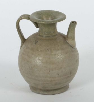 China, Tang bis nördliche Song-Dynastie, 617 - 1126, Provinz Zhejiang, wohl Shanglinhu-Brennöfen, Yue-Ware, Steingut, grau-grün glasiert, Kugelform mit leicht gerillter Wandung, Henkel in Zungenform, Gefäß auf Standkante, H: ca. 7,8 cm. Provenienz: Bayerische Privatsammlung.
