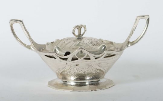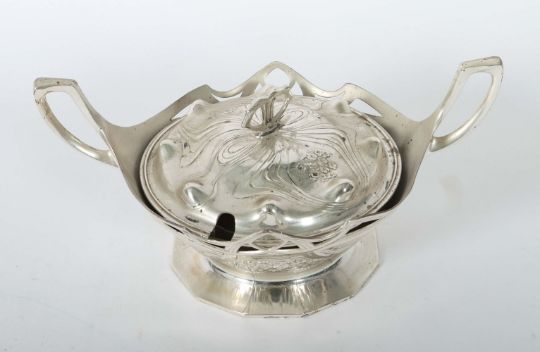 Anfang 20. Jh., Zinn poliert, hexagonaler Stand sich nach obenhin verjüngend, die sich erweiternde Wandung tls. durchbrochen gearbeitet, reliefplastisches Floraldekor, seitliche Handhaben, farbloser Glaseinsatz, aufgewölbter Deckel in konformem Dekor, D: ca. 24,5 cm. Altersspuren, Glaseinsatz erg.