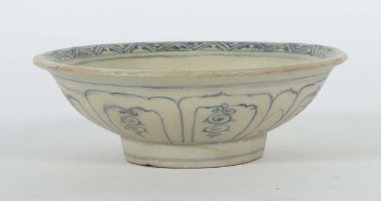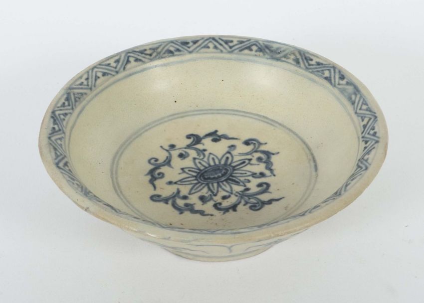 Vietnam, Ming-Dynastie, 14./15. Jh., Chu Dau-Keramik, glasiert, blaues Unterglasurdekor, die Außenwandung in aufgeteilte Felder mit Ornament, die Innenseite mit zentraler Blüte im Doppelkreis, die Mündung mit Ornamentband, HxD: ca. 4,5/13,1 cm. Provenienz: Bayerische Privatsammlung.