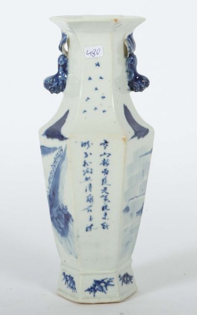 China, Qing Dynastie, 19. Jh., Porzellan, Dekor mit blauer Unterglasurmalerei, die Schauseite dekoriert mit Seenlandschaft und Bergen, die Rückseite mit Calligraphie, die Handhaben als Fo-Hunde plastisch ausgearbeitet, ungemarkt, H: ca. 25,5 cm. Provenienz: Bayerische Privatsammlung.
