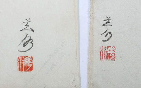 Japan, Tuschezeichnung, drei variierende, florale Darstellungen: Kirschblüte, Kiefer und Narzisse, je bez. und mit rotem Stempel, HxB: bis 38/54 cm. Knicke.