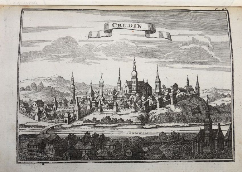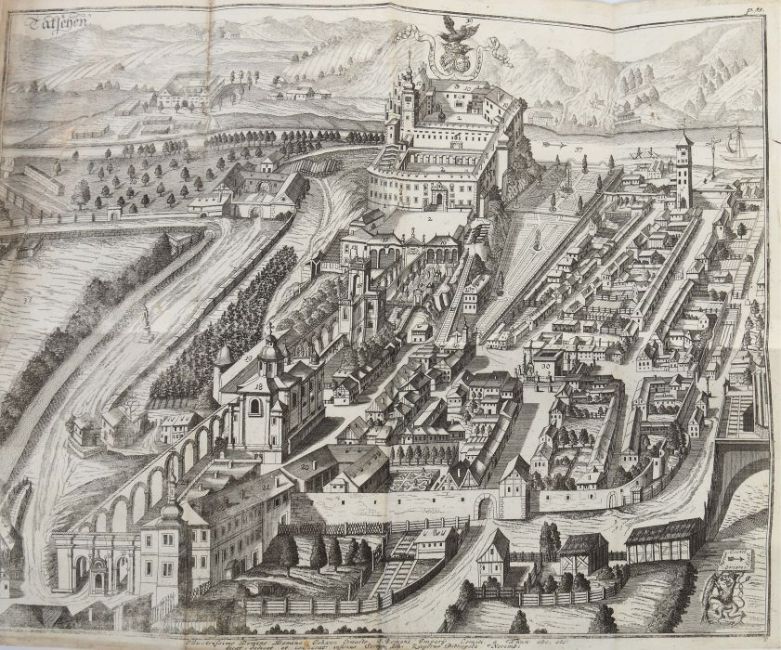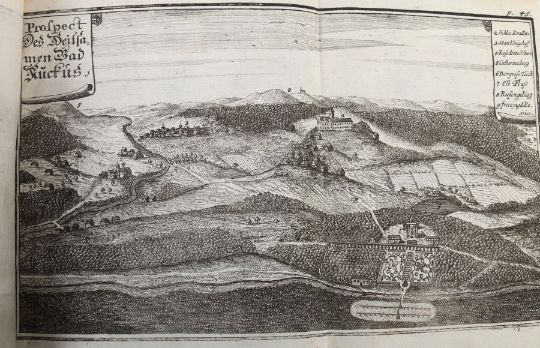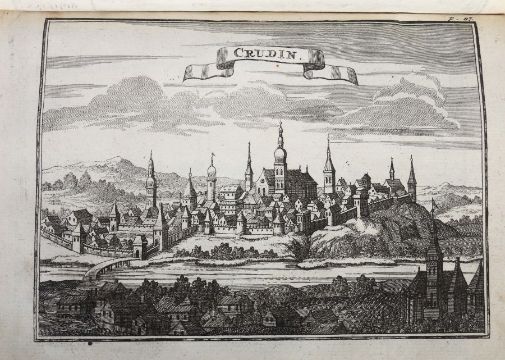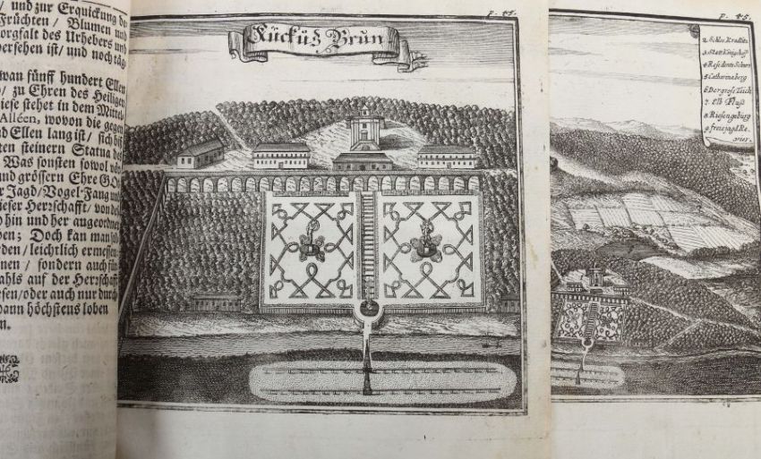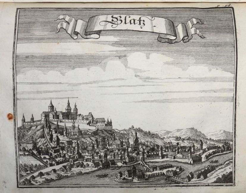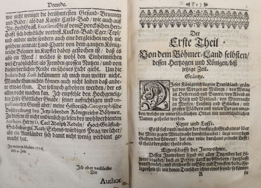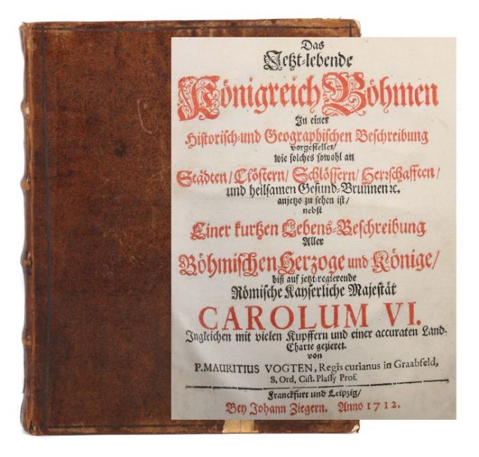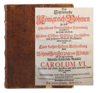 Das Jetzt-lebende Königreich Böhmen zu einer historisch- und geographischen Beschreibung vorgestellet, wie solches sowohl an Städten, Clöstern, Schlössern, Herrschafften, und heilsamen Gesund-Brunnen etc. anjetzo zu sehen ist ..., Frankfurt/Leipzig, Zieger, 1712, Frontispiz mit Stadtansicht Prags, mit 42 von ursprünglich 43 tls. mehrfach gefalteten Kupferstichtafeln, u.a. Prag (26x69 cm) von Chr. Friedr. Krieger gestochen, Halblederband der Zeit auf 4 Bünden, Oktav. Stärkere Altersspuren, part. besch. und fleckig, die Karte fehlend.
