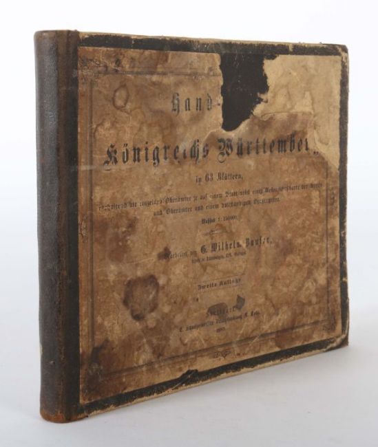Hand-Atlas des Königreichs Württemberg in 63 Blättern, Stuttgart, Schweizerbart, 1885, zweite Auflage, flächenkolorierte Karten, Halblederband mit Fragmenten des orig. Einbandes, Quer Großoktav. Starke Altersspuren, besch., Seiten vereinzelt lose, eine Karte unvollständig, Karte 3 fehlend, Risse & Eintragungen.