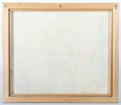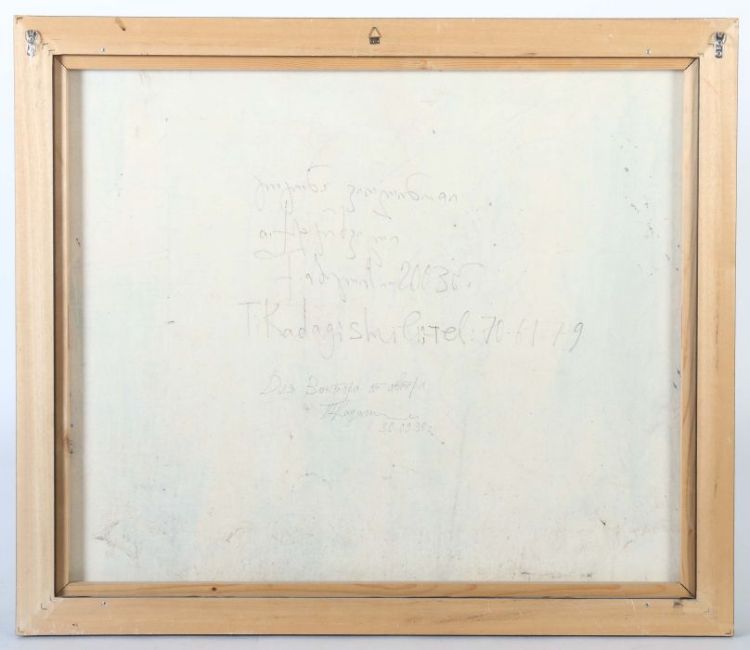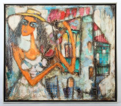 geb. 1958, russischer Maler. "Frau mit Geige", stilisierte Darstellung einer Frau vor Architekturkulisse Geige spielend, unten links Ritzsign. und dat. 2003, rückseitig bez., Acryl/Leinwand, HxB: 84/72 cm. Mit Rahmen.