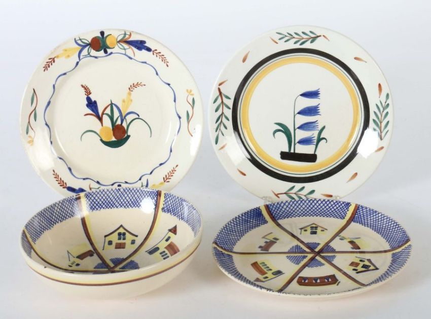 Deutschland, Velten-Vordamm u.a., 20. Jh., Steingut, beige glasiert und mit Floraldekor, Architektur und Zügen in Aufglasurmalerei dekoriert, bodenseitig tlw. unterglasurgrüne Stempelmarken bzw. ein Teller mit Pressmarke, D: ca. 18-19,5 cm. Craqueléebildung.