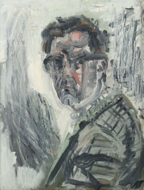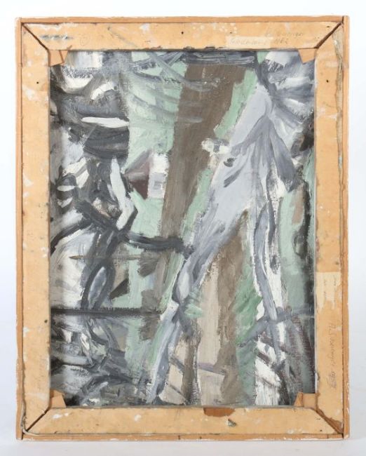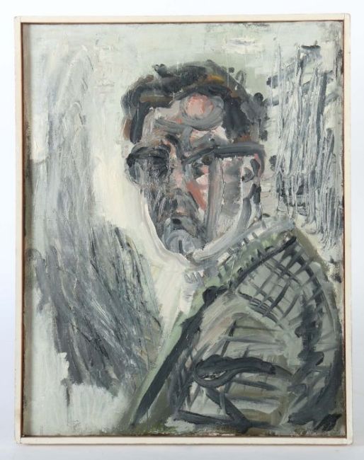 Stuttgart 1922 - 2005 ebenda, Maler und Grafiker, Stud. an der Akad. Stuttgart bei Baumeister, Gollwitzer, Meid und Henninger. "Selbstportrait", stilisiertes Bildnis im Halbprofil, vor hellem Hintergrund, unten rechts monogr., Keilrahmen mit Kugelschreiber sign., bez und dat. 1962, rückseitig eine stilisierte Landschaftsdarstellung, Öl/Leinwand, HxB: 70/55 cm. Altersspuren, Craquelée. Mit Rahmen. Lit.: Gert K. Nagel, Schwäbisches Künstlerlexikon. Provenienz: Direkt aus dem Nachlass des Künstlers.