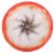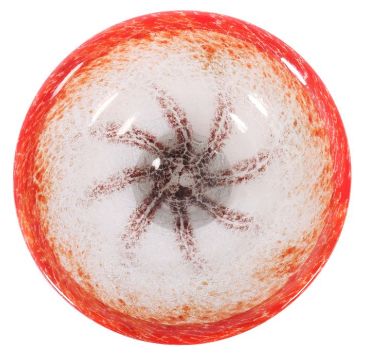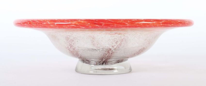 WMF, Geislingen, Karl Wiedmann (Dekortechnik), 1930er Jahre, farbloses, dickwandiges Glas, auf konischem Fuß mit ausgeschliffenem Abriss die Schale mit zwischen den Schichten geäderten, silbrig-weißen Einschmelzungen, zusätzlich strahlenförmig verlaufende, ochsenblutfarbene sowie vom umgeschlagenen Rand ausgehende rote Farb- und Oxideinschmelzungen, HxD: 10,5/34 cm.