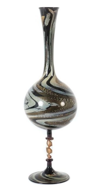 Wohl Deutschland, dat. 1983, äußerst dünnes, dunkelviolettes Glas mit hochgestochenem Boden, der Schaft tlw. in farblosem Glas mit spiralförmig eingeschmolzenem goldenen Glitter, die Wandung sowie der Fuß mit Aufschmelzungen aus Goldfolie und in blau-silberner Spiralform, über dem schmalen Schaft kugelige Vase mit langem, sich nach oben hin öffnendem Hals, bodenseitig geritzte Bez. und Dat. "Gp. 83", H: ca. 36,7 cm.
