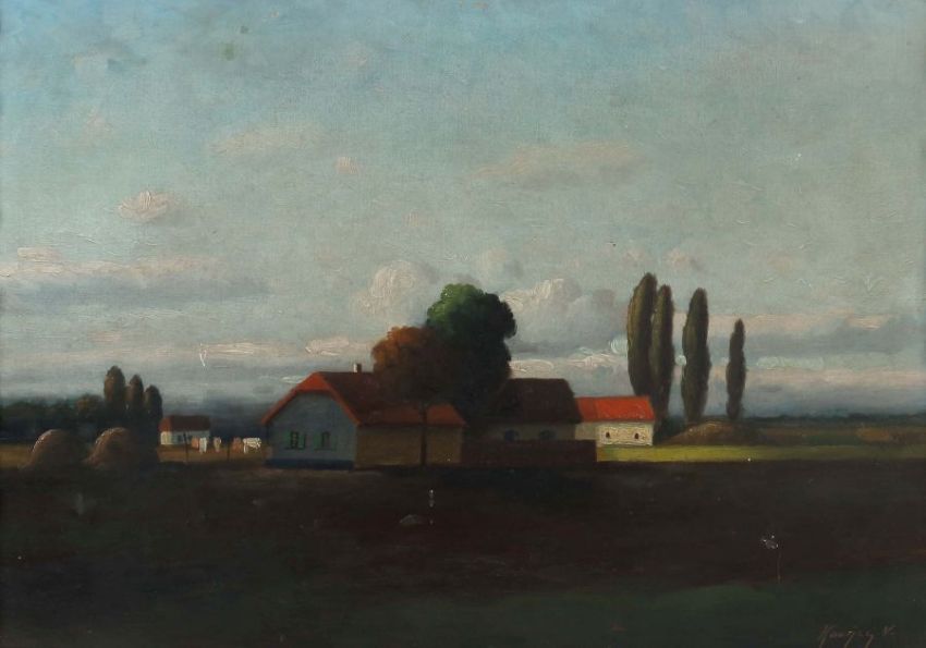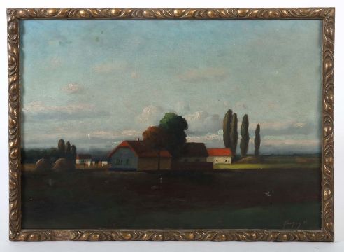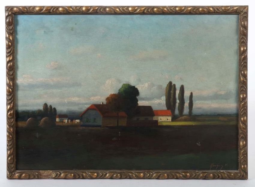 "Landschaft mit Gehöft", stilisierte reduzierte Darstellung im Herbst, unten rechts sign. "Kovncy V. (?)", Öl/Karton, HxB: 49/69 cm. Altersspuren, verschmutzt, min. Farbabplatzer. Mit Rahmen (besch.).
