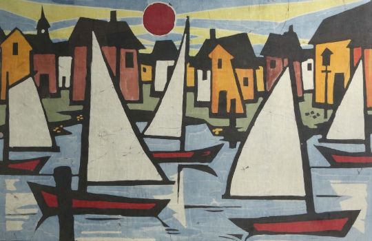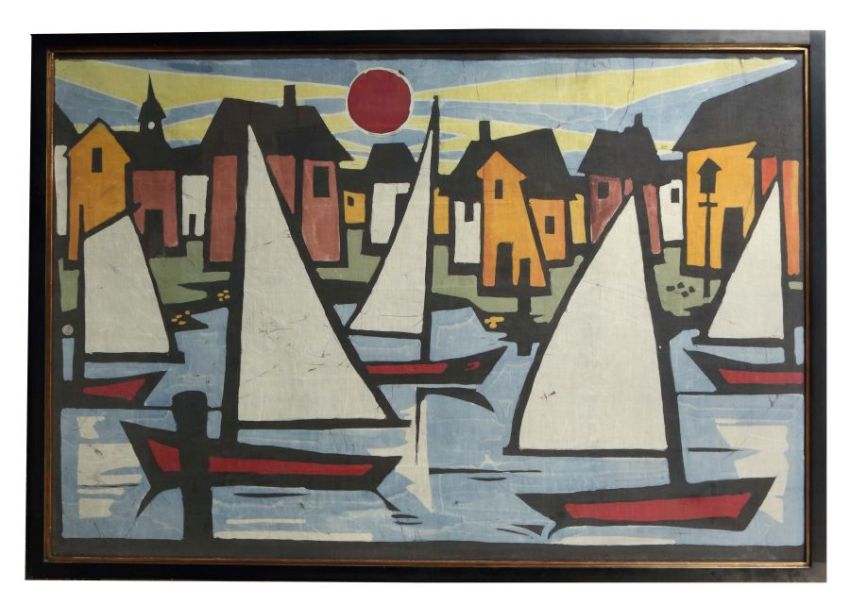 "Yachthafen im Abendrot", Segelboote vor Häuserkulisse, unsign., Gouache und Papier/Pressspanplatte, HxB: 80/120 cm. Mit verglastem Rahmen.