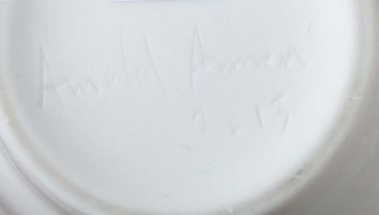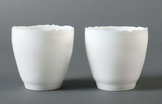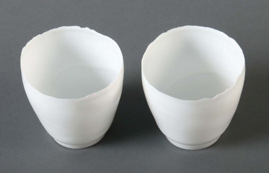 Geb. 1952 Gsteig bei Gstaad (Schweiz), schweizer Porzellankünstler. 2 Schalen, dat. 2015, Porzellan, mit Laufglasur versehen, äußerst dünnwandige, durchscheinende Schalen in Becherform mit unregelmäßig gezacktem Rand, bodenseitig sign. und dat., eine Bodenseite unglasiert, H: ca. 8,5 cm. Eine Schale mit min. Craquelée.