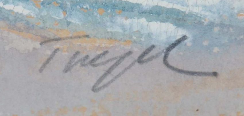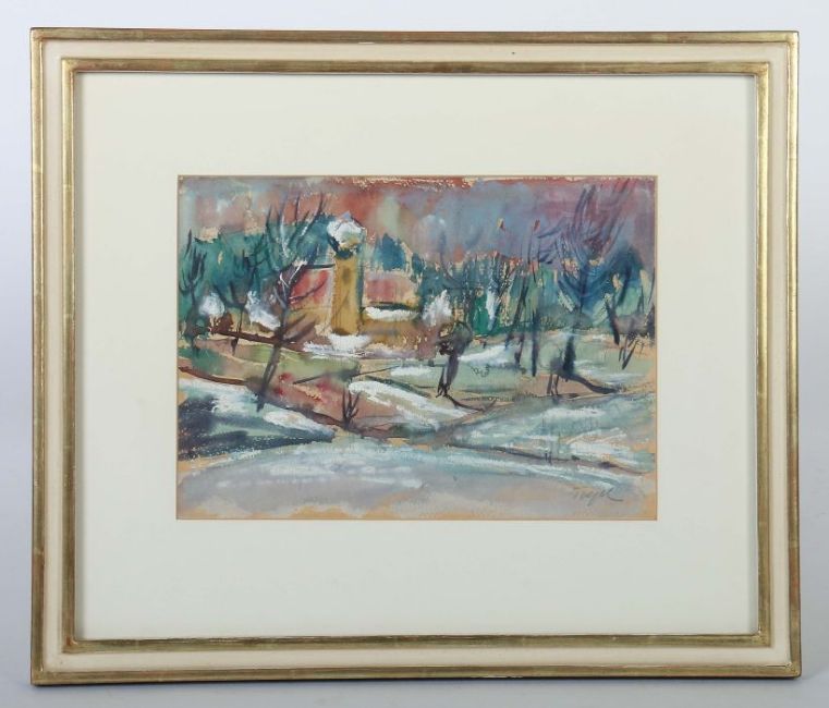 geb. 1928, Maler in Möhringen. "Winterlandschaft", Darstellung mit einem Teich, Bäumen und Architektur im Hintergrund, unten rechts sign. "Trepl", Mischtechnik/Papier, HxB: 20/28 cm (Passepartoutausschnitt). Leicht gewellt, min. Craquelée. Im Passepartout hinter Glas gerahmt.