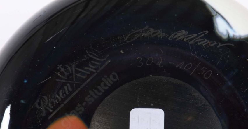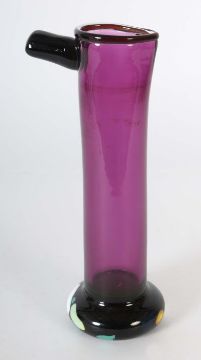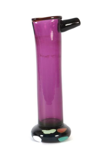 Deutschland, Rosenthal Glas-Studio, 2. Hälfte 20. Jh., violettes, dickwandiges Glas mit ausgekugeltem Abriss, über rundem, flachgedrücktem Stand zylindrische Vase mit Ausguss und Henkel, die Mündung mit aufgeschmolzenem, weißem Glasfaden, der Stand mit eingeschmolzenen Farbflecken, bodenseitig geätzte Bodenmarke "Rosenthal glas-studio" sowie unleserl. Sign., geritzte Modellnr. 302 und Auflage 10/50, H: ca. 29,8 cm. Min. Altersspuren, Ablagerungen.