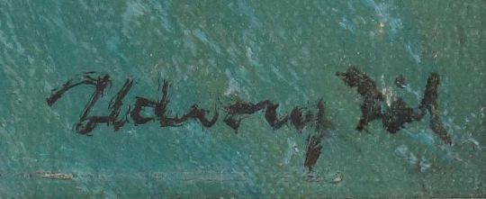 Budapest 1900 - 1987 ebenda, ungarischer Maler. "Pferdepflege", stilisierte Darstellung zweier Pferdejungen bei der Reinigung der Tiere, vor Dorfkulisse, unten rechts sign., Öl/Leinwand, HxB: 70/85 cm. Min. Farbabrieb. Mit Rahmen.