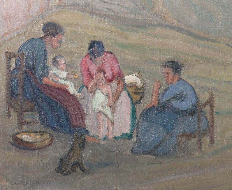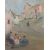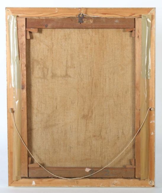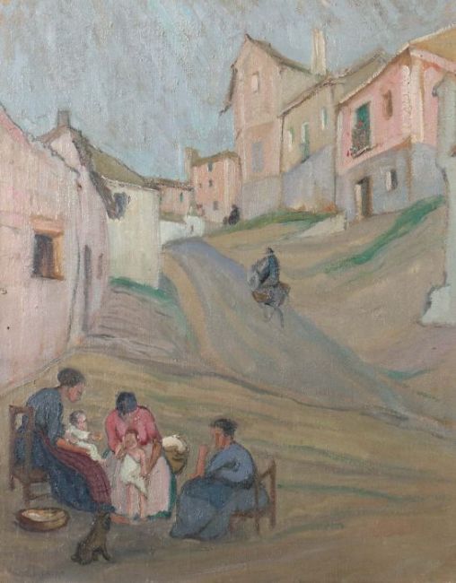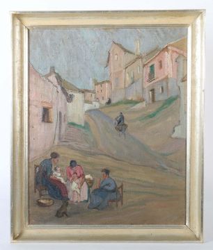 "Südländische Straßenszene", Blick auf eine nach oben führende Straße zwischen gereihten Häusern, im Vordergrund am Straßenrand drei Frauem mit Kindern sitzend, unten links undeutl. sign. und dat. 1983, Öl/Leinwand, HxB: 80/65 cm. Altersspuren, verschmutzt, min. Farbabrieb. Mit Rahmen.