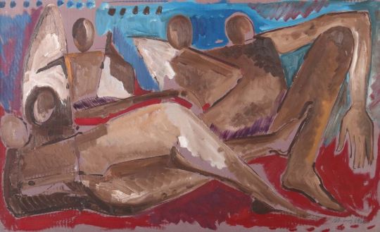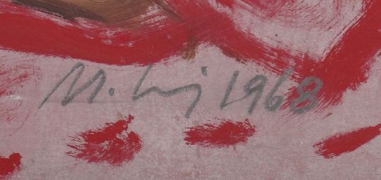 1935 - 2015, Bildhauer, Maler und Grafiker in Stuttgart, Stud. an der Akad. Stuttgart bei Hils. "Reclining Nudes", abstrakte, mehrfigurige Aktdarstellung vor polychromem Hintergrund, unten rechts sign. und dat. 1968, verso sign., dat. und bet., Öl/Karton, HxB: ca. 59/97,5 cm. Min. Altersspuren, Farbabplatzer. Mit Rahmen. Provenienz: Direkt aus dem Atelier des Künstlers. Abgebildet in Lit.: Ottmar Mohring - Gemälde 1956-1986, Katalog zur Ausstellung "Begegnungen mit der Kunst", Baden-Württembergische Bank AG (Hrsg.), 1987, S. 53.