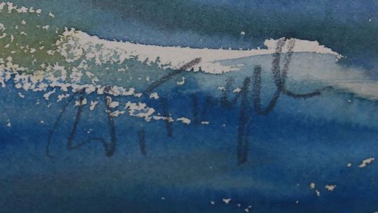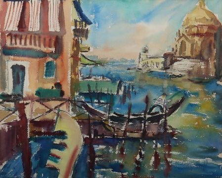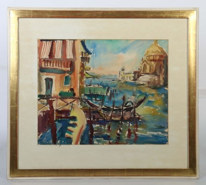 geb. 1928, Maler in Möhringen. "Venedig", Blick auf den Canale Grande mit der Santa Maria della Salute und einem Gondoliere im Vordergrund, stilisierte Darstellung, unten rechts sign. "Trepl", Aquarell/Papier, HxB: 48/60 cm (Passepartoutausschnitt). Min. gewellt. Im Passepartout hinter Glas gerahmt.