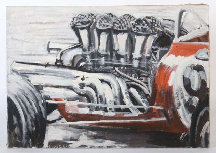 Stuttgart 1922 - 2005 ebenda, Maler und Grafiker, Stud. an der Akad. Stuttgart bei Baumeister, Gollwitzer, Meid und Henninger. "Sportwagen mit offenem Motorblock", stilisierte Darstellung, unten rechts monogr., Öl/Leinwand, HxB: 72/103 cm. Lit.: Gert K. Nagel, Schwäbisches Künstlerlexikon. Provenienz: Direkt aus dem Nachlass des Künstlers.