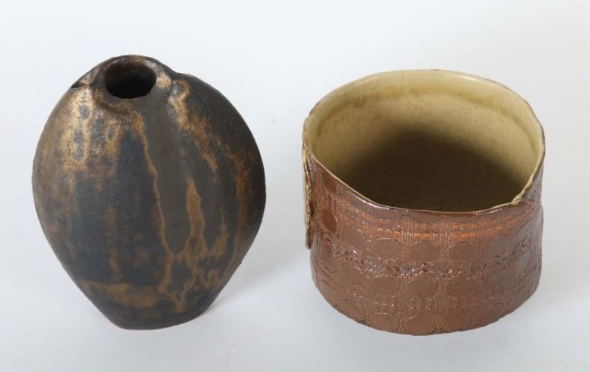 Deutschland, Mitte/Ende 20. Jh., beiger bzw. rotbrauner Scherben, die Vase von Signe Lehmann-Pistorius (1925-2012) mit tlw. reliefiert gearbeiteter Wandung und part. schuppenartigem Dekor, die andere Vase von schmaler Ovalform mit drei Öffnungen, die Wandung schwarz-gold glasiert, bodenseitig je Werkstattpressmarken, H: 10-15 cm.