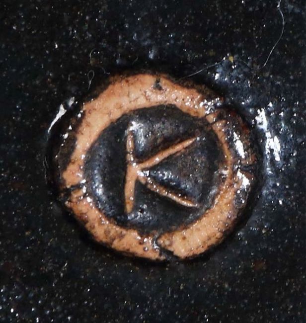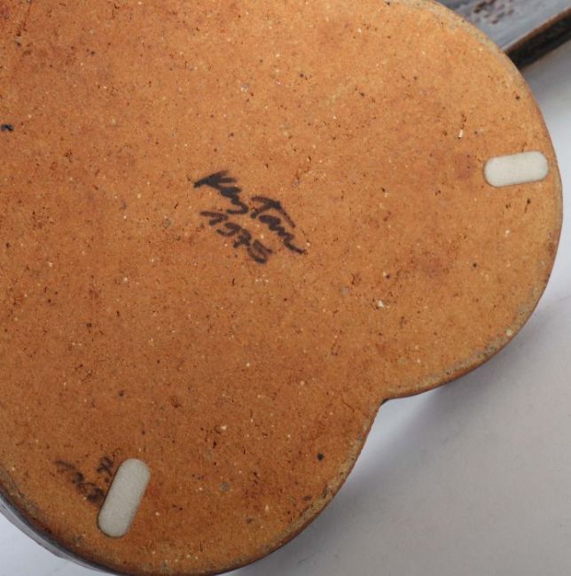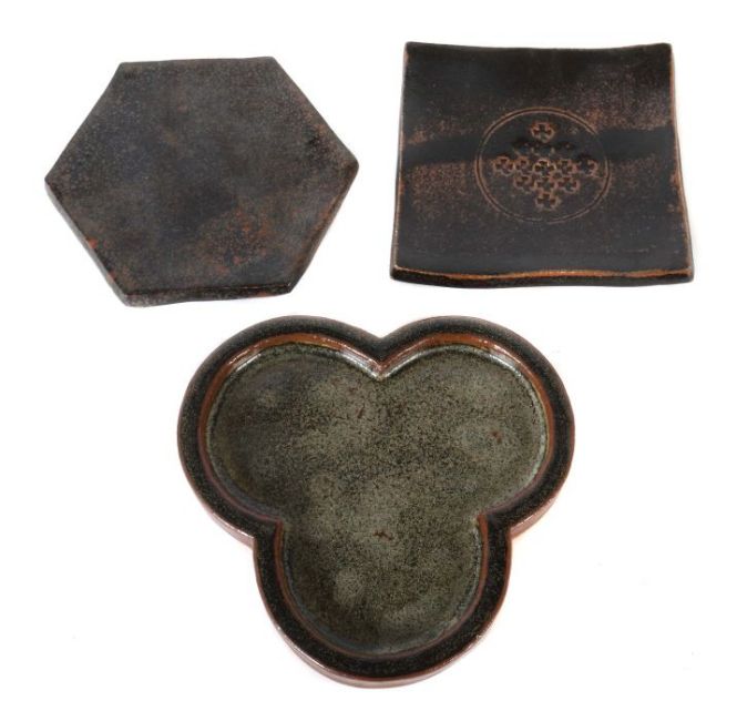 Frankfurt 1941 - 2005 Kandern. 3 flache Schalen, Kandern, 1970/80er Jahre bzw. dat. 1975, rotbrauner bzw. beiger Scherben, 2 flache Schalen auf runden Standringen, eine hexagonal geformt, die andere quadratisch, je schwarzbraun glasiert, die Quadratische mittig mit gepresstem Dekor, die dritte Schale ohne Standring in dreipassiger Form, glasiert in Schwarz, Braun und Grau-Grün, 2 Teile bodenseitig mit gepresstem Werkstattzeichen, ein Teil von Hand sign. und dat. "Kerstan 1975", D: ca. 14,5-16,5 cm.