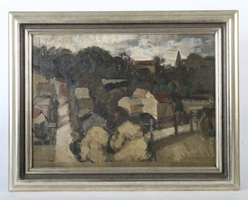 Stuttgart 1922 - 2005 ebenda, Maler und Grafiker, Stud. an der Akad. Stuttgart bei Baumeister, Gollwitzer, Meid und Henninger. "Schwäbische Landschaft", Blick auf Häuser und Bäume, unten rechts monogr., rückseitig eine weitere Darstellung , Öl/Hartfaser, HxB: 42/58 cm. Altersspuren, Craquelée. Mit Rahmen. Lit.: Gert K. Nagel, Schwäbisches Künstlerlexikon. Provenienz: Direkt aus dem Nachlass des Künstlers.