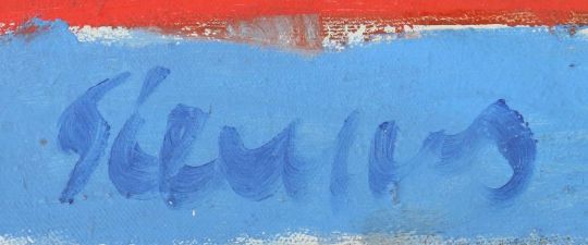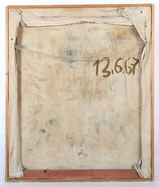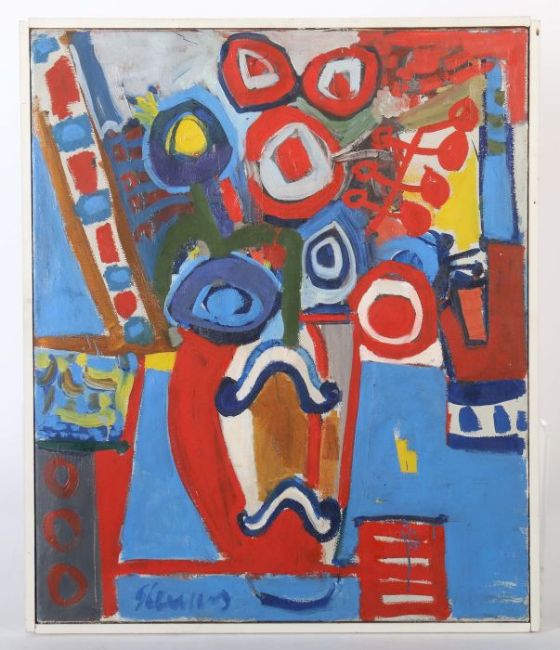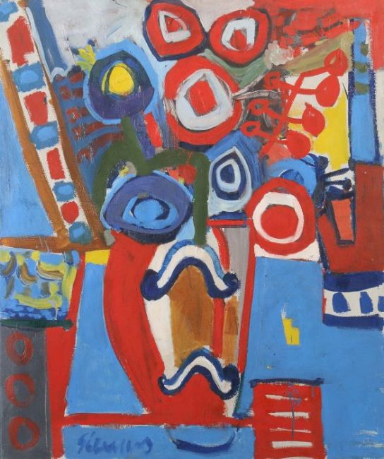 "Blumenstillleben", abstrakte Komposition des Blumenarrangements im Interieur, unten links sign., verso dat. "13.6.67", Öl/Leinwand, HxB: 85/70 cm. Alters- und Schmutzspuren. Mit Rahmen.