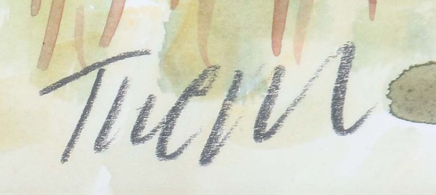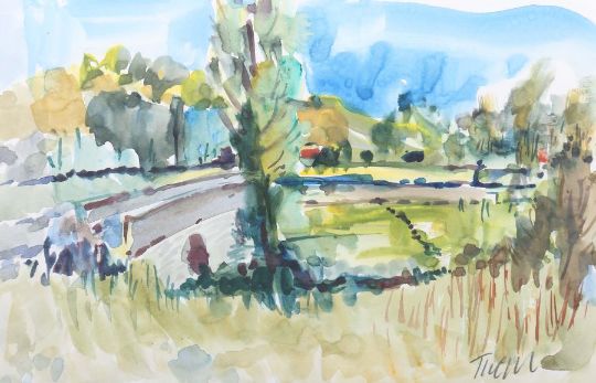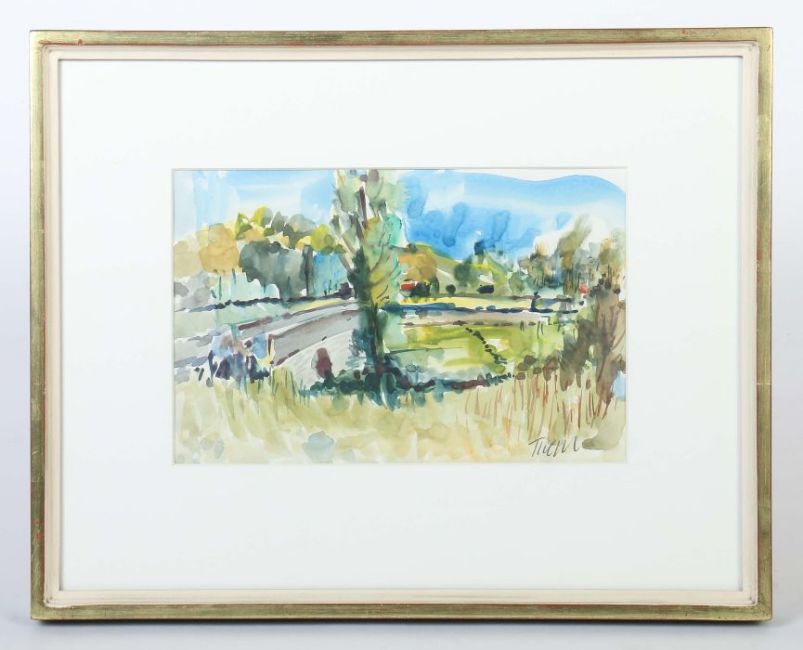 geb. 1928, Maler in Möhringen. "Sommerlandschaft", stilisierte Darstellung, unten rechts sign. "Trepl", Aquarell/Papier, HxB: 19/29 cm (Passepartoutausschnitt). Im Passepartout hinter Glas gerahmt.