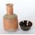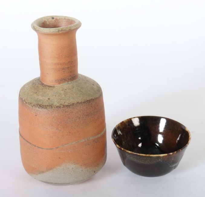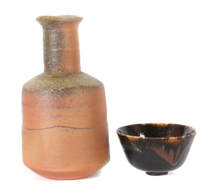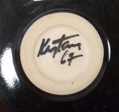 Frankfurt 1941 - 2005 Kandern. Vase und Fingerschale, Kandern, dat. 1986(?) und (19)67, rotbrauner bzw. beiger Scherben, die Vase mit zylindrischer Form und schmalem Hals, part. beige glasiert bzw. mit Einfärbungen, die Fingerschale schwarz-braun glasiert und zusätzlich mit Laufglasur in Braun- und Schwarztönen, part. mit pinken Einschlüssen überzogen, bodenseitig je von Hand sign. und dat. "Kerstan 12.5.1986" (?) bzw. "Kerstan 67", die Vase zusätzlich mit gepresstem Werkstattzeichen, H: 22,5 cm bzw. D: ca. 11,5 cm. Die Schale min. best..
