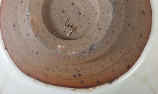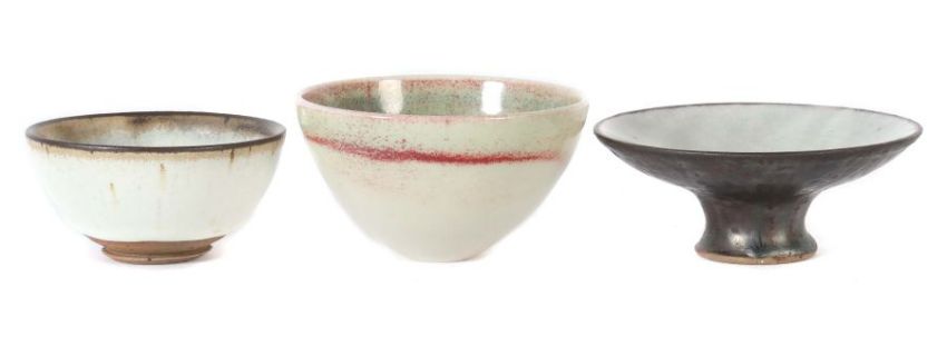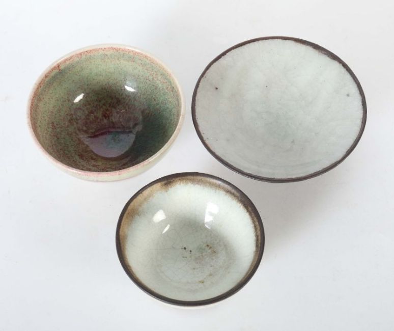 Deutschland, 2. Hälfte 20. Jh., Steinzeug, eine Schale und Aufsatzschale umlaufend gräulich-weiß glasiert mit abgesetzten braunen Rändern, die dritte Schale mit polychromen Farbeinschmelzungen in der Glasur, diese bodenseitig mit Ritzzeichen "St" wohl für Wendelin Stahl (1922-2000) und Zusatz "wsm", D: ca. 10,3-12,8 cm. Tlw. Craqueléebildung.