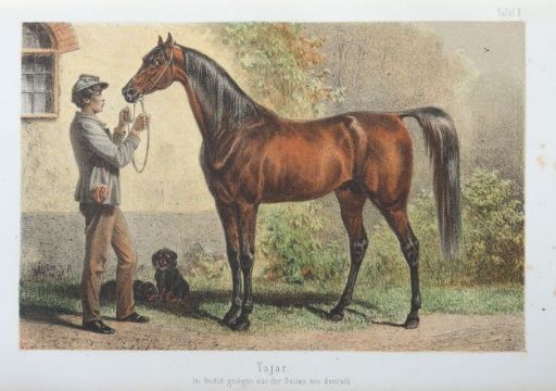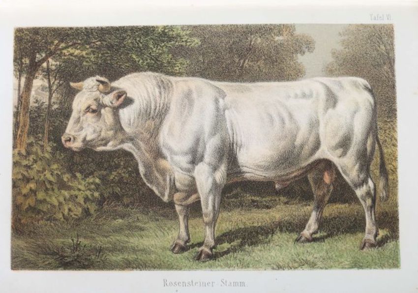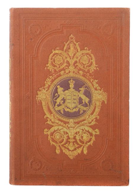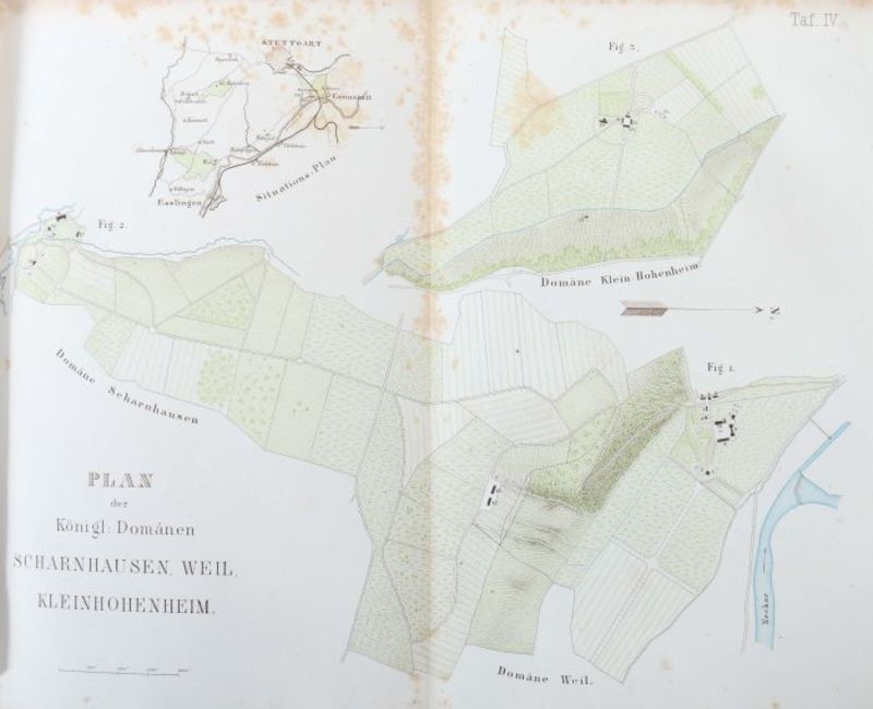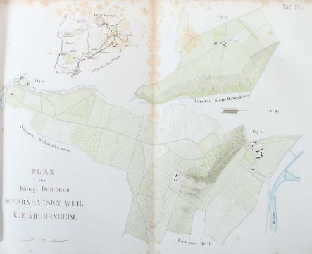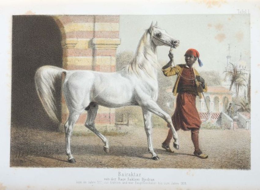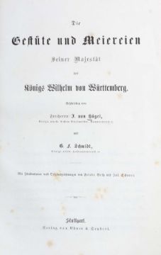 Die Gestüte und Meiereien Seiner Majestät des Königs Wilhelm von Württemberg, Stuttgart, Ebner & Seubert, 1861, 220 S., mit 5 farb. lithografierten Tafeln, 2 gefalteten farbig lithografierten Plänen und zahlr. Textholzschnitten, goldgeprägter Halbleinenband, Quart. Altersspuren, part. ber./best., stärker stockfleckig, Vorsatz mit handschriftlichen Vermerken.