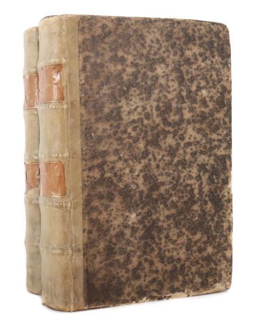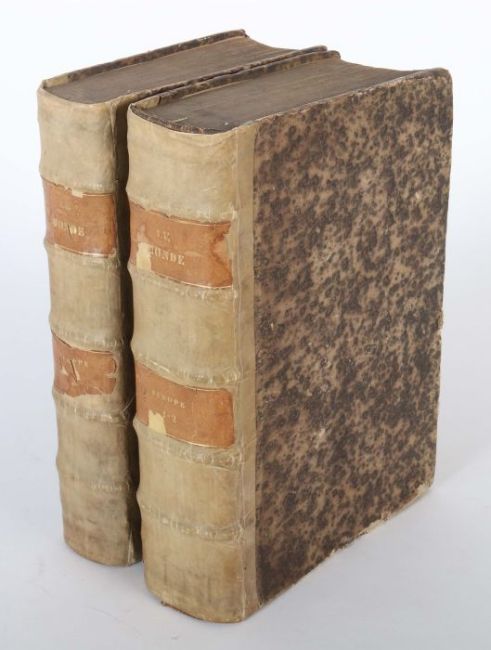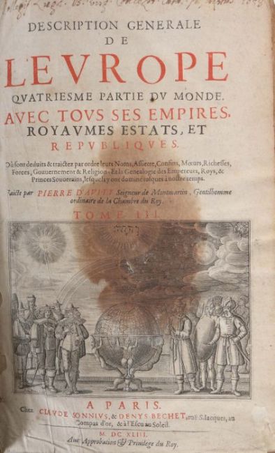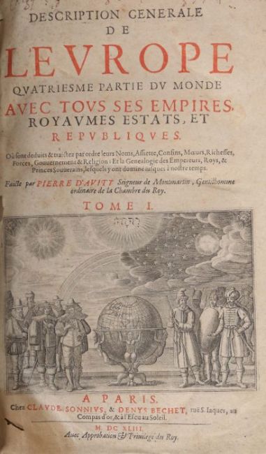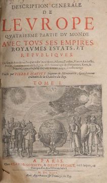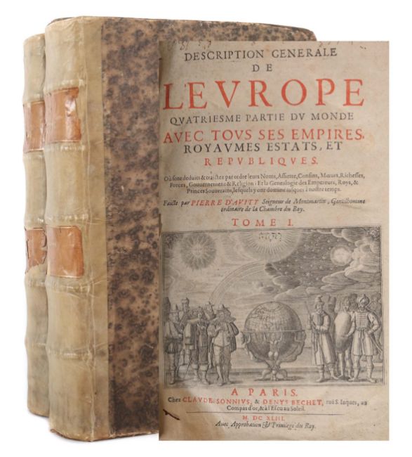 Description generale de l'Europe Quatriesme partie du monde avec tous ses empires royaumes estats, et republiques , Paris, Sonnius & Bechet, 1643, 3 Teile in 2 Bänden, 894+460+1051 S., je mit Titelvignette, Halbpergamentband mit Rückenschildchen, Folio. Stärkere Altersspuren, part. besch. und stärker fleckig, S. 207-230 des ersten Teils fehlend.