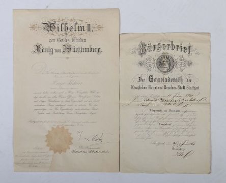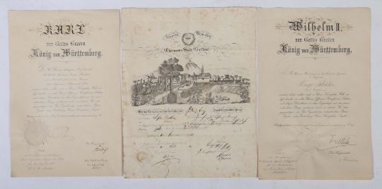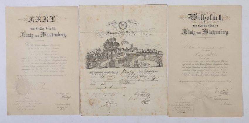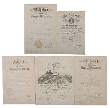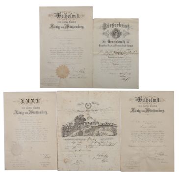 5-tlg. best aus: Patent als Hauptmann, Wilhelm II. König von Württemberg, 1902, mit Unterschrift und Siegel; Lehrbrief der Oberamtsstadt Gaildorf, 1840, mit Lithografie, Siegel und Unterschriften; Bürgerbrief, Stuttgart, 1860, mit Unterschrift; Patent als Premierlieutnant, Wilhelm II. von Württemberg, 1894, mit Unterschrift und Siegel; Patent als Secondlieutnant, Karl König von Württemberg, 1887, mit Unterschrift und Siegel. Altersspuren, tls. stärker stockfleckig.
